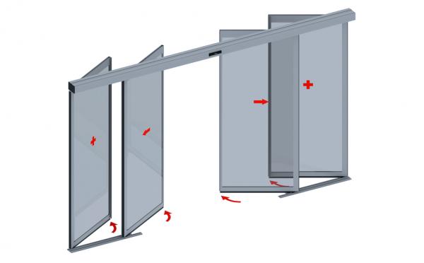 В обычном режиме дверь работает как стандартная раздвижная система, однако, при возникновении чрезвычайной ситуации все четыре створки легко открываются наружу, формируя широкий эвакуационный выход.